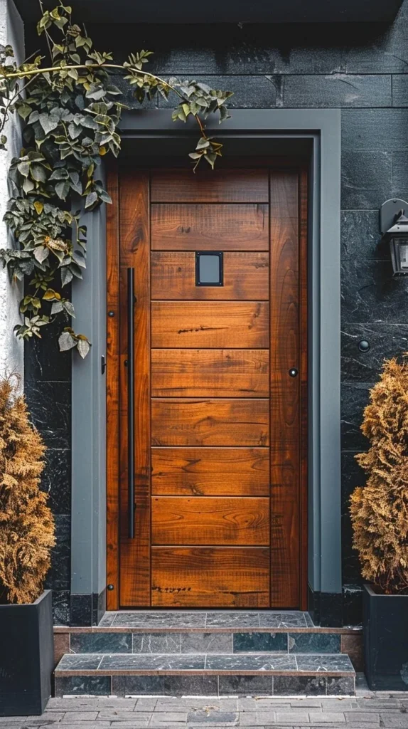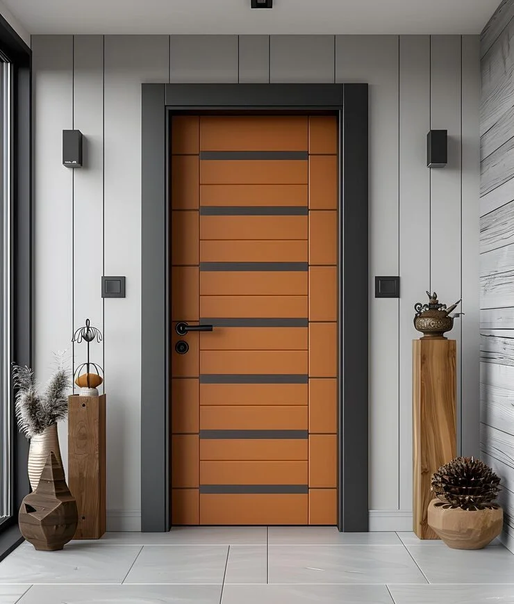 The horizontal plank design with those subtle black accent strips creates visual rhythm without shouting for attention. Each stripe guides your eye across the door’s surface, adding depth and dimension that a flat panel just can’t match. And that black frame? It’s doing serious heavy lifting, creating a gallery-like border that turns the door itself into a work of art.