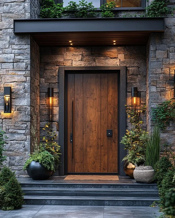 ✨ Pro Tip: That glowing stone alcove effect is pure lighting magic! Install warm white LED strip lights (2700K) along the top edge of your alcove, angled to wash down the stone. This creates those gorgeous shadow lines and makes the texture pop. For budget-friendly stone, use manufactured stone veneer in “ledger stack” style—it’s lightweight, easier to install than real stone, and looks identical once installed. The warm amber tones come from choosing stones with gold, tan, and rust undertones. Paint your door in a rich stain (Minwax “Dark Walnut” or “Jacobean”), then seal with marine-grade polyurethane for weather protection. That vertical plank look can be achieved by adding 1×4 boards to a flat door surface, then staining everything together for a seamless appearance.