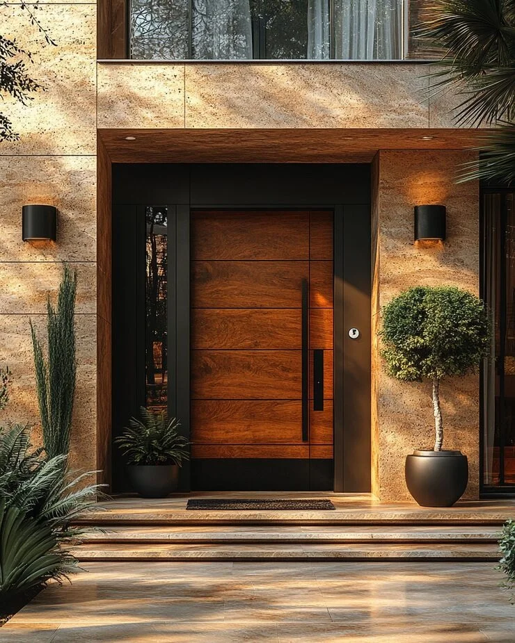 Okay, now we’re talking serious kerb appeal. This entrance doesn’t just welcome you—it makes you feel like you’re checking into a five-star resort. That rich mahogany door with its sweeping wood grain, set against a sleek black frame and bathed in warm golden light? It’s the kind of design that photographs beautifully at sunset and looks even better in person.