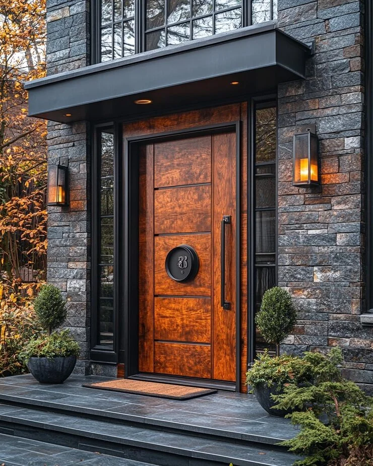 There’s something deeply satisfying about the contrast happening here. That rich copper-toned door—warm, inviting, almost glowing—framed by sleek charcoal black trim that’s as modern as tomorrow. It’s the kind of design that makes you stop scrolling and think, “Wait, a door can do that?”