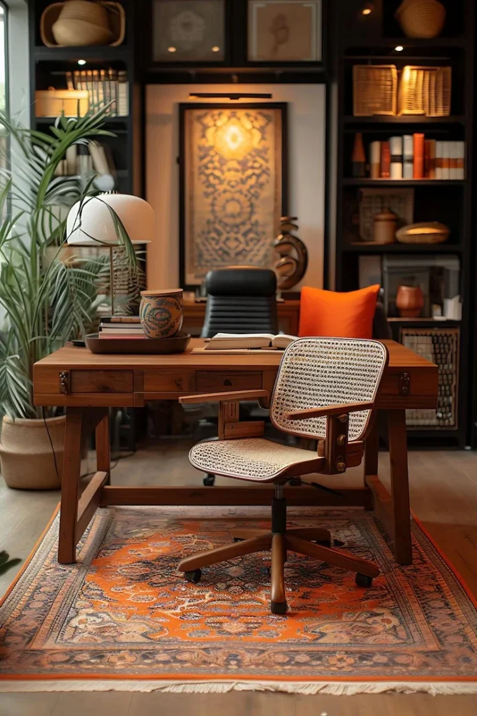 - Layered textiles (Persian rug, orange pillow) inject personality