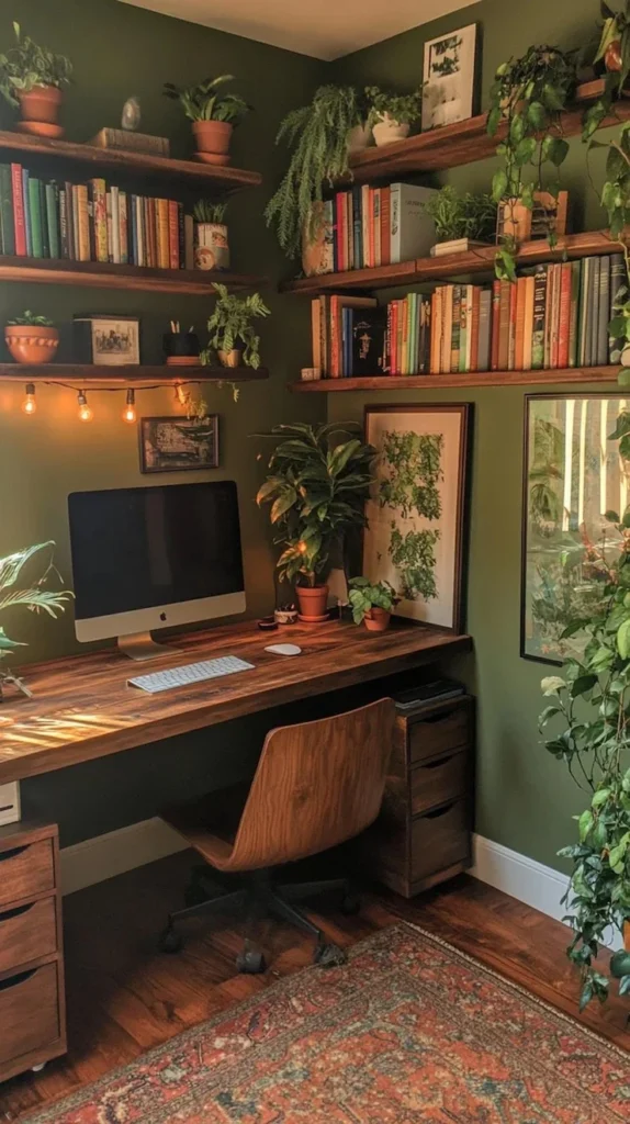 - Sage green walls reduce eye strain and promote calm focus