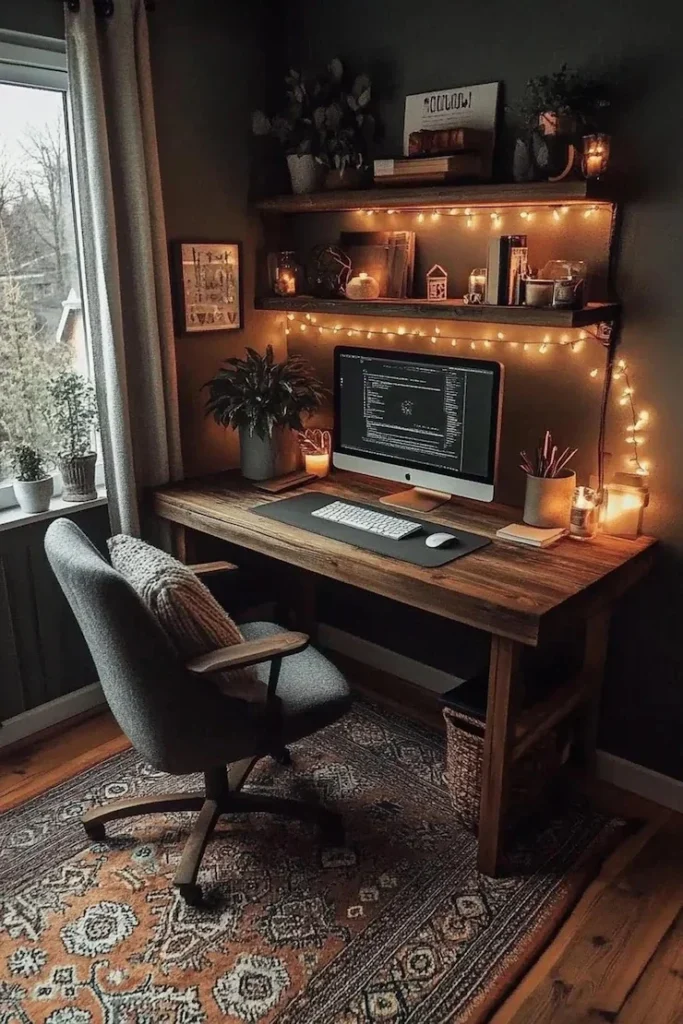 - String lights create a cozy glow for late-night work sessions