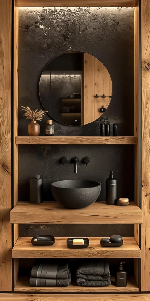 Pro Tip: Use open wooden shelves to display neutral-toned towels and black ceramic accessories. The layered look adds depth without visual noise. Please keep it simple. Keep it zen.