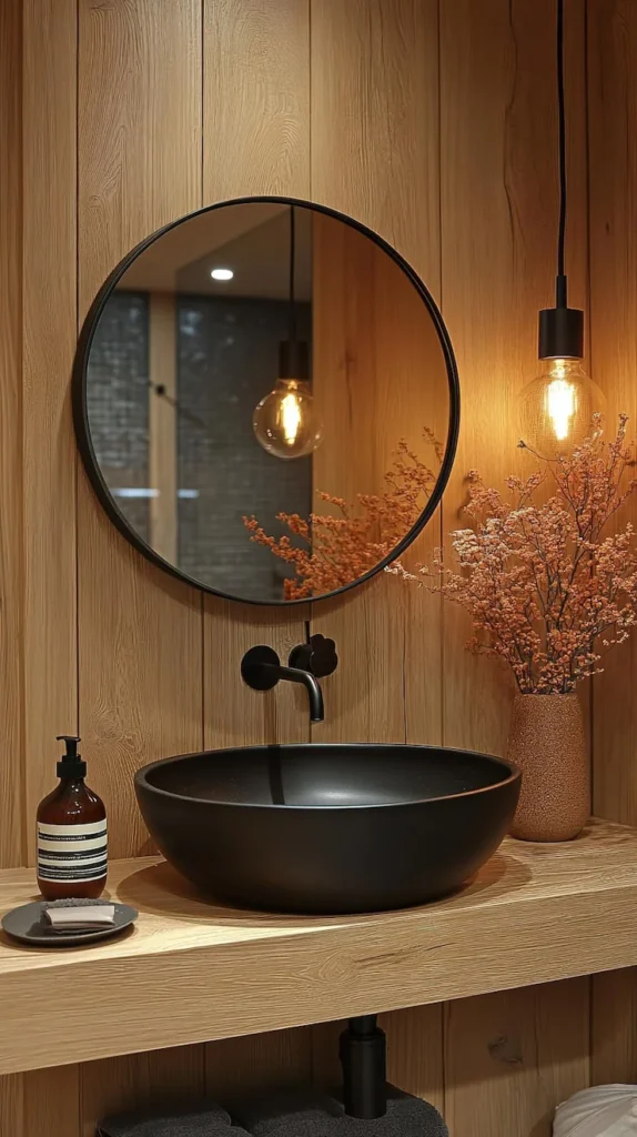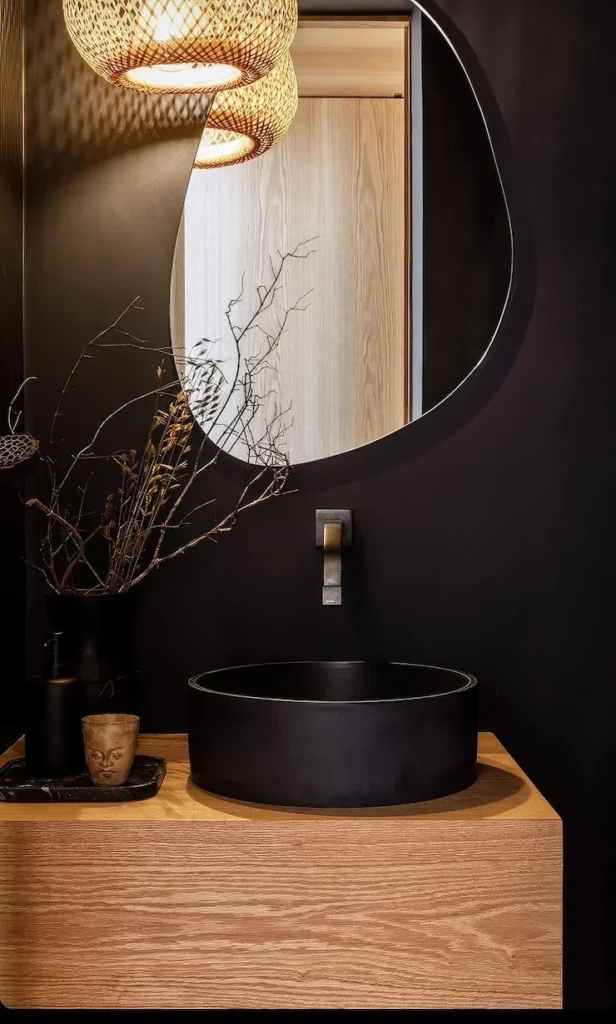 1. 🌿 The Zen Master: Black Stone Basin Meets Warm Wood Harmony