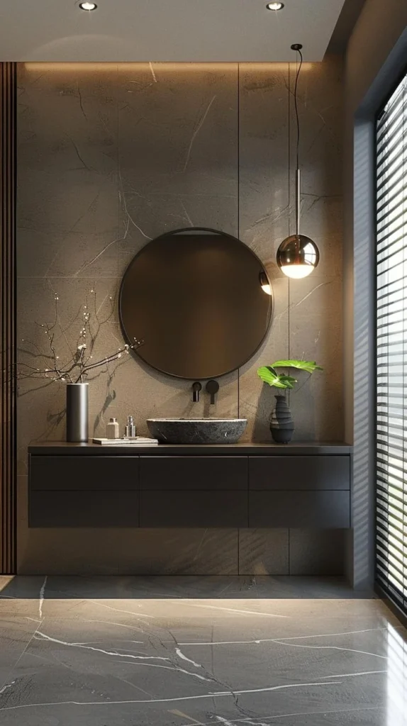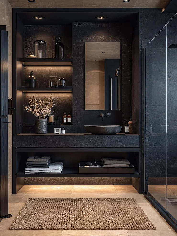If you love industrial-modern aesthetics with a luxury twist — if you want a bathroom that feels like a private urban loft or boutique hotel — this is your dream. It’s dark, dramatic, and deeply sophisticated.