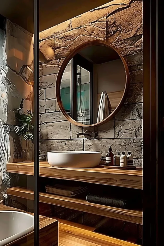 Pro Tip: Keep accessories minimal and natural — dark bottles, wooden trays, rolled towels in charcoal or cream. Let the stone wall be the star. 🌟