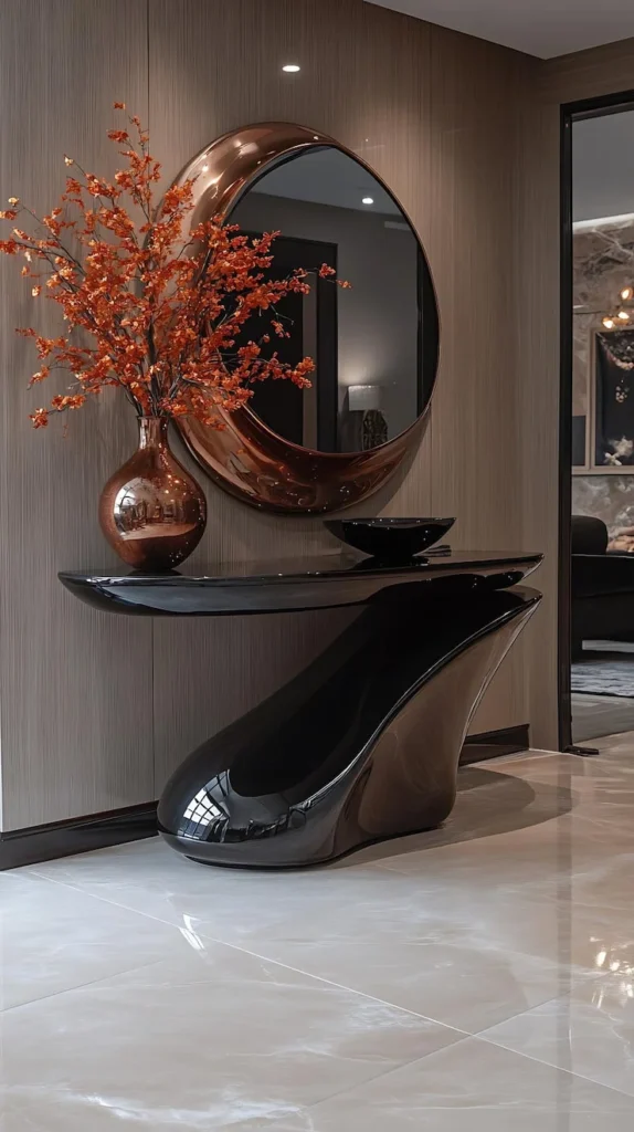 And check out that copper rose gold vase filled with vibrant burnt orange branches. It’s the perfect color echo — warm, inviting, and utterly sophisticated.